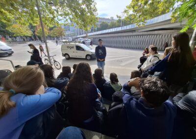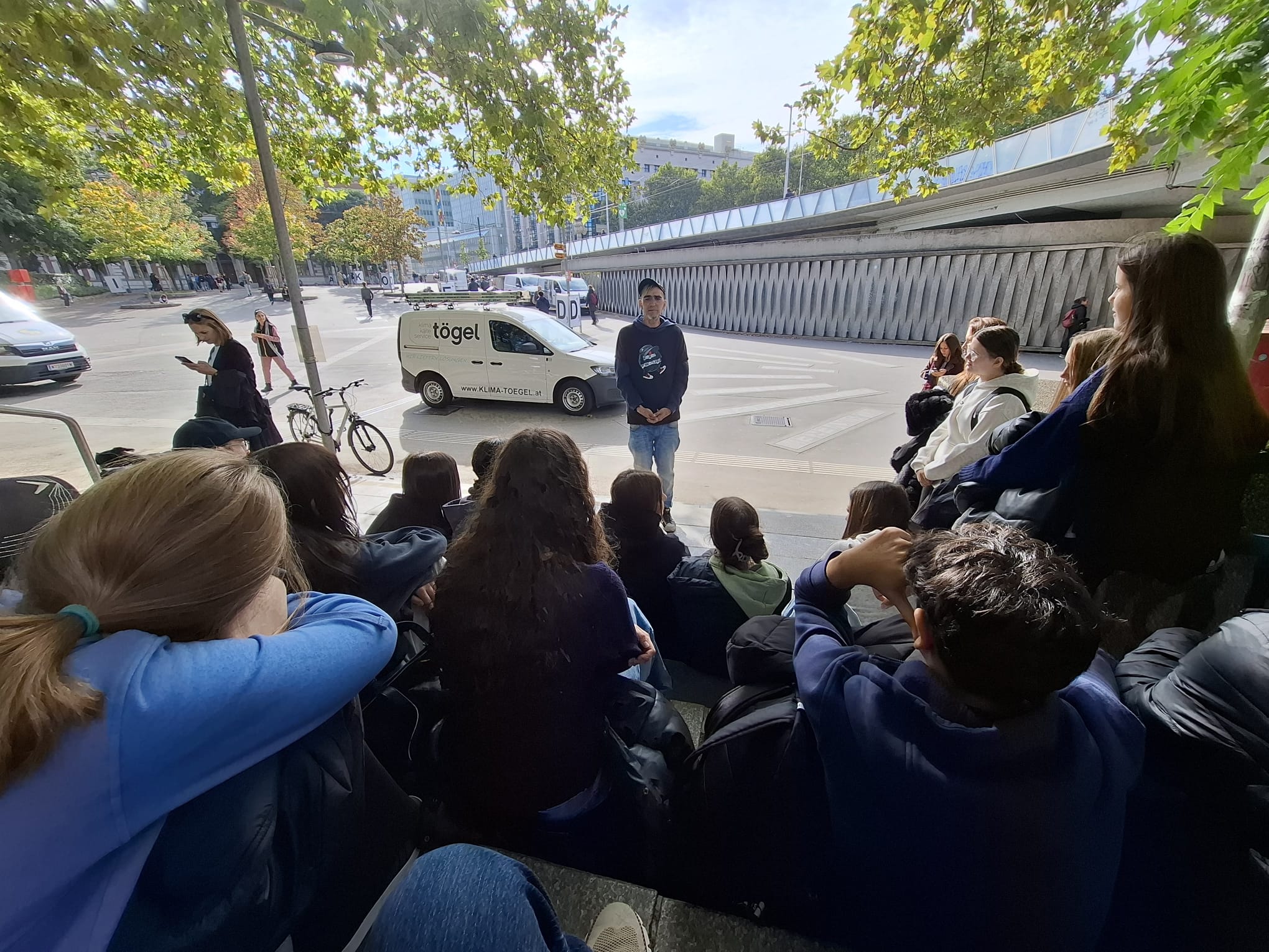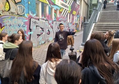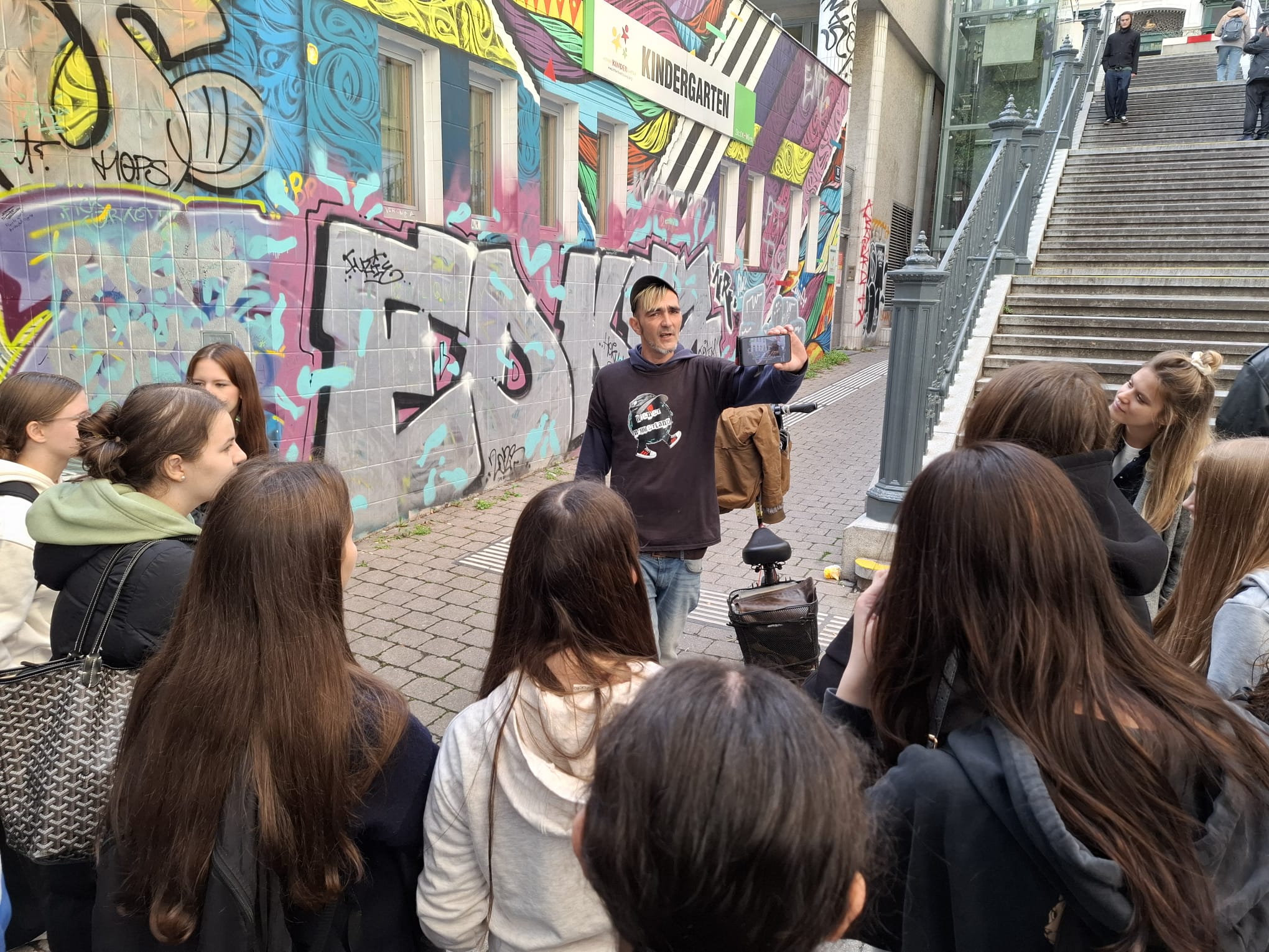 Martin führte die Schülerinnen und Schüler über den Karlsplatz und durch den 6. Bezirk, hielt bei einigen Stationen und berichtete dabei offen und authentisch von seinem alten Leben – von seiner Drogensucht und den Konsequenzen, von seiner Obdachlosigkeit, vom Leben auf der Straße und von seinem Weg raus aus der Sucht. Dabei waren die vielen persönlichen Geschichten besonders eindrucksvoll. Zum Abschluss erzählte er außerdem einige spannende Anekdoten über die bekannte Hausbesetzung der „Pizzeria Anarchia“ im Jahr 2014 und zeigte uns viele Bilder und Videos.